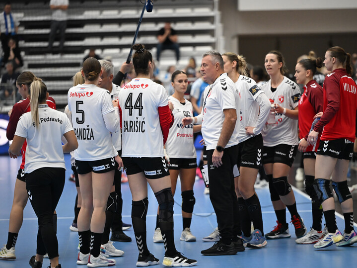 Descriere: Handbalistele croate la un timeout alaturi de antrenorul lor Ivica Obrvan in meciul de handbal feminin dintre CSM Bucuresti si HC Podravka Koprivnica, din cadrul Ligii Campionilor, desfasurat in Sala Dinamo din Bucuresti, duminica 5 octombrie 2025. © FOTO:Razvan Pasarica/SPORT PICTURES