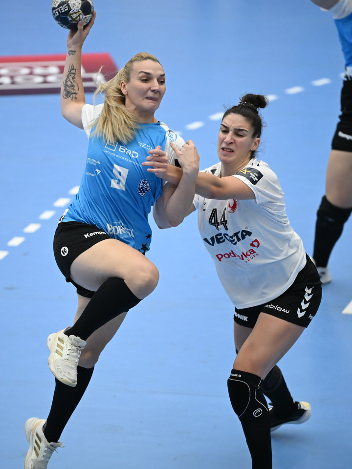 Descriere: Dana Andreea Rotaru si Tina Barisic in meciul de handbal feminin dintre CSM Bucuresti si HC Podravka Koprivnica, din cadrul Ligii Campionilor, desfasurat in Sala Dinamo din Bucuresti, duminica 5 octombrie 2025. © FOTO:Razvan Pasarica/SPORT PICTURES