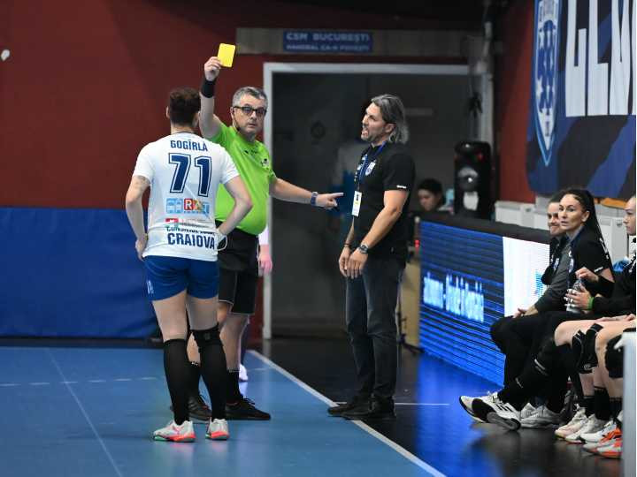 Descriere: Arbitrul ii acorda un cartonas galben lui Adrian Vasile sub privirile Alinei Iordache in meciul de handbal feminin dintre CSM Bucuresti si SCM Universitatea Craiova, din cadrul Ligii Florilor, desfasurat in Sala Apollo din Bucuresti, duminica 12 octombrie 2025. © FOTO:Razvan Pasarica/SPORT PICTURES