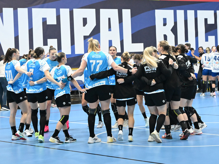Descriere: Handbalistele bucurestene printre care Inger Smits, Kristina Sirum Novak, Alexandra Szoke Dindiligan si Djurdjina Jaukovic se bucura intr-o hora dupa victoria din meciul de handbal feminin dintre CSM Bucuresti si SCM Universitatea Craiova, din cadrul Ligii Florilor, desfasurat in Sala Apollo din Bucuresti, duminica 12 octombrie 2025. © FOTO:Razvan Pasarica/SPORT PICTURES