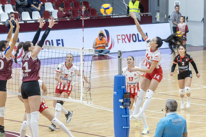 Descriere: Radostina Marinova, Olga Skrypak, Ana Cristina Miron si Andra Cojocaru in meciul de volei feminin dintre CS Rapid Bucuresti si CS Dinamo Bucuresti, contand pentru Divizia A1 Feminin, desfasurat în Sala Polivalenta Rapid din Bucuresti, sambata 18 octombrie2025. © FOTO:Mihai Neacsu/SPORT PICTURES