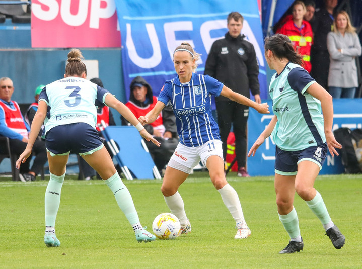 Descriere: Claudia Chiper si Courtney Ruedt, Macy Ruth Schultz in meciul de fotbal feminin dintre Farul Constanta si HB Køge, contand pentru UEFA Europa Cup, desfasurat pe terenul central din cadrul Academiei Gheorghe Hagi din Ovidiu, miercuri 17 septembrie 2025. © FOTO: Sorin Danielciuc/SPORT PICTURES