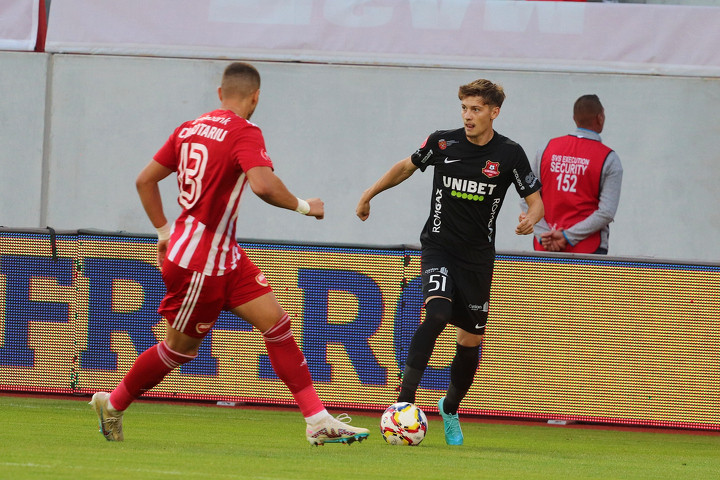 Descriere: Oroian in duel cu Denis Ciobotariu in meciul de fotbal dintre AFS HERMANNSTADT SIBIU si SEPSI OSK SFANTU GHEORGHE contand pentru CUPA ROMANIEI BETANO, desfasurat pe Stadionul Municipal din Sibiu, miercuri 27 septembrie 2023. © FOTO: Valentin MACREA/SPORT PICTURES