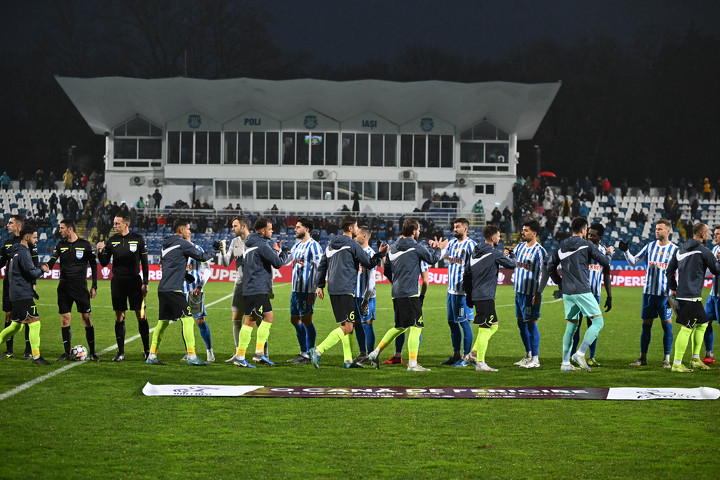 Descriere: Fotbali?tii celor dou? echipe se salut? înaintea meciului de fotbal dintre Poli Ia?i si FC Farul Constan?a, contând pentru SuperLiga Superbet, desf??urat pe Stadionul Emil Alexandrescu din Ia?i, duminic? 8 decembrie 2024. © FOTO: Tudi/SPORT PICTURES
