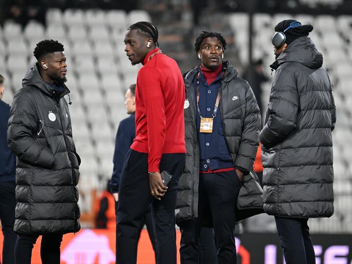 Descriere: Fotbaliștii ros-albastrii Enagnon David Kiki, Joyskim Aurelien Dawa Tchakonte, Jordan Youri Gele si Malcolm Sylas Laouari Edjouma la inspectia terenului inaintea meciului de fotbal dintre PAOK Salonic si FCSB, din cadrul UEFA Europa League, desfasurat pe Stadionul Toumba din Salonic, joi 13 februarie 2025. © FOTO:Razvan Pasarica/SPORT PICTURES