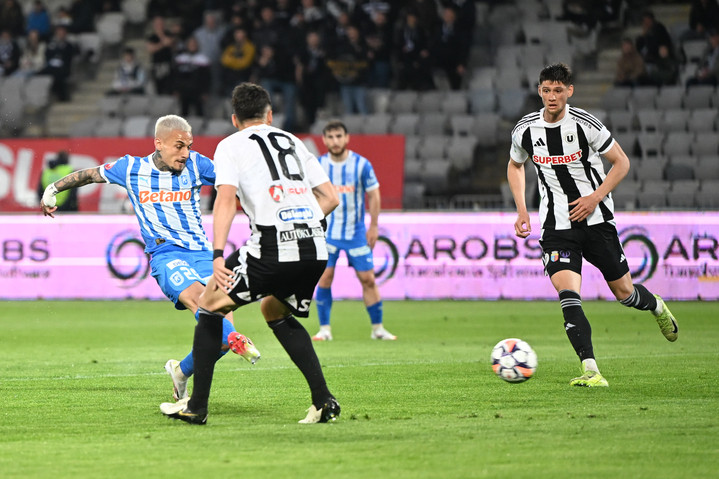 Descriere: Ionuț Alexandru Mitriță marchează un gol de lângă Vladislav Blanuta în meciul de fotbal dintre Universitatea Cluj si Universitatea Craiova, contând pentru Play off-ul Superligii Superbet, desfășurat pe Cluj Arena din Cluj Napoca, sambata 26 aprilie 2025. © FOTO:Răzvan Pasarica/SPORT PICTURES