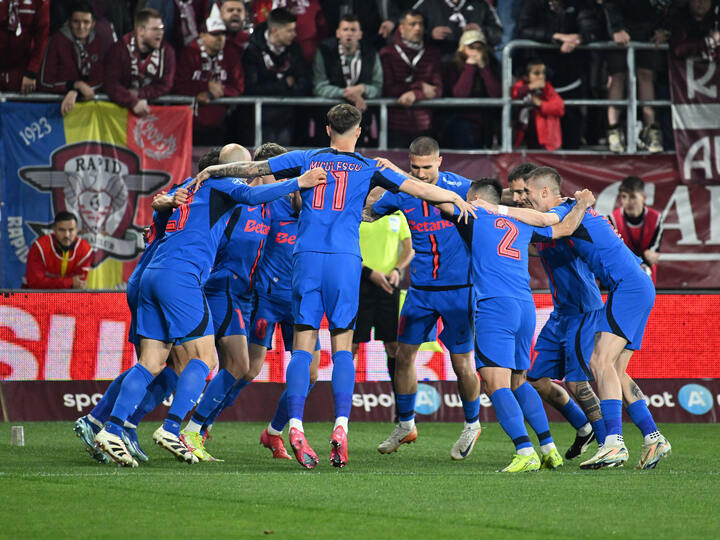 Descriere: Hora a bucuriei ros albastre cu George Daniel Bîrligea, Valentin Cretu, Juri Cisotti si Florin Lucian Tănase dupa un gol marcat in meciul de fotbal dintre Rapid Bucuresti si FCSB, din cadrul Play off-ului Superligii Superbet, desfasurat pe Superbet Arena Giulesti din Bucuresti, luni 27 aprilie 2025. © FOTO:Razvan Pasarica/SPORT PICTURES