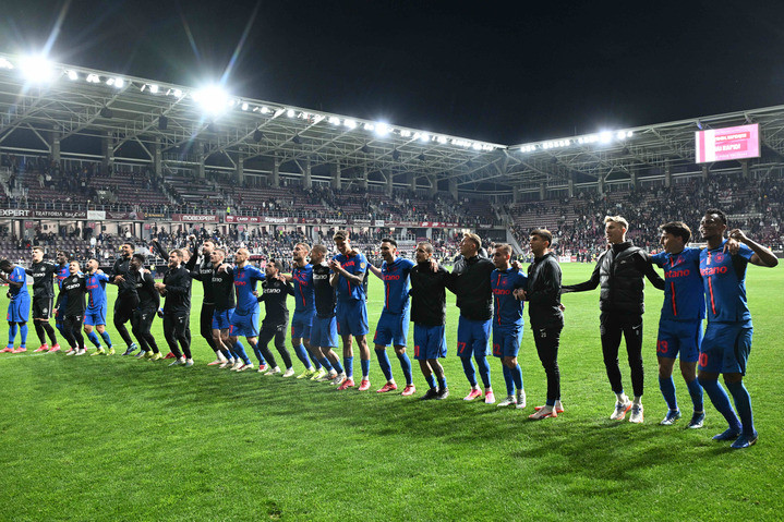 Descriere: Fotbaliștii ros-albastrii Baba Alhassan, Ștefan Târnovanu, Marius Ștefănescu, Valentin Cretu, Mihai Răzvan Udrea, Lukas Zima, Florin Lucian Tănase, Alexandru Mihail Baluță, Mihai Daniel Lixandru, George Daniel Bîrligea, David Raul Miculescu, Adrian Gheorghe Șut, Juri Cisotti, Andrei Cosmin Gheorghita, Mihai Vlăduț Toma, Octavian George Popescu, , Risto Radunovic si Siyabonga Ngezana salută galeria după meciul de fotbal dintre Rapid Bucuresti si FCSB, din cadrul Play off-ului Superligii Superbet, desfasurat pe Superbet Arena Giulesti din Bucuresti, luni 27 aprilie 2025. © FOTO:Razvan Pasarica/SPORT PICTURES