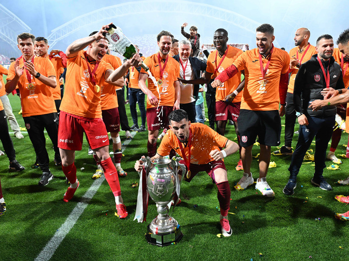 Descriere: Meriton Korenica pozeaza alături de trofeu, sub baia de sampanie administrata de Maximilian Mihai Popa, sub privirile lui Damjan Djokovic, Moustapha Name si Mario Camora (Malico Paulino Mario Jorge) dupa meciul de fotbal dintre CFR Cluj si FC Hermannstadt, finala Cupei Romaniei Betano, desfasurat pe Stadionul Francisc Neuman din Arad, miercuri 14 mai 2025. © FOTO:Razvan Pasarica/SPORT PICTURES