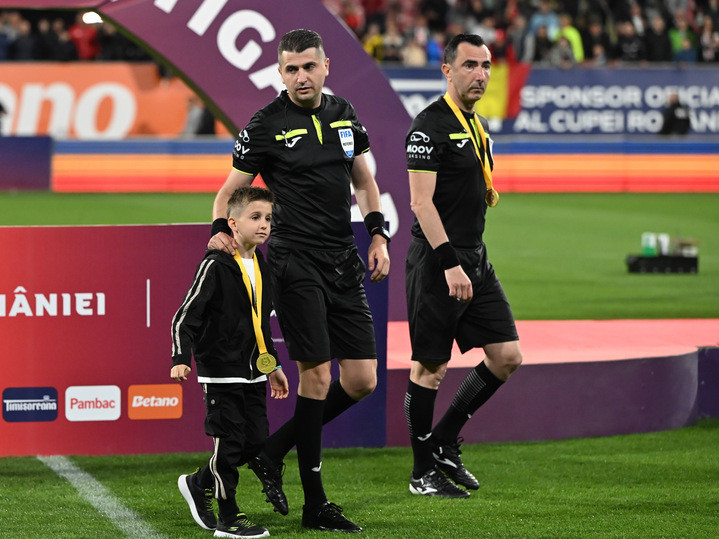 Descriere: Arbitrul central Andrei Florin Chivulete si arbitrul asistent Andrei Constantinescu premiati dupa meciul de fotbal dintre CFR Cluj si FC Hermannstadt, finala Cupei Romaniei Betano, desfasurat pe Stadionul Francisc Neuman din Arad, miercuri 14 mai 2025. © FOTO:Razvan Pasarica/SPORT PICTURES