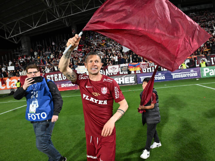 Descriere: Fotbalistii clujeni printre care Otto Hindrich, Matei Christian Ilie, Maximilian Mihai Popa, Damjan Djokovic, Mohammed Kesselly Kamara, Aly Abeid si Simao Pedro Dias Da Rocha Ciprian Ioan Deac si Mario Camora (Malico Paulino Mario Jorge) se bucura alături de trofeu si antrenorul lor Dan Vasile Petrescu dupa meciul de fotbal dintre CFR Cluj si FC Hermannstadt, finala Cupei Romaniei Betano, desfasurat pe Stadionul Francisc Neuman din Arad, miercuri 14 mai 2025. © FOTO:Razvan Pasarica/SPORT PICTURES
