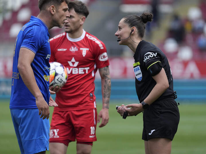 Descriere: Arbitrul central Iuliana Elena Demetrescu si Constantin Dragos Albu in meciul de fotbal dintre UTA Arad si Gloria Buzau, contand pentru Superliga Superbet Play-Out, desfasurat pe Arena Francisc Neuman din Arad, sambata 17 mai 2025. © FOTO: Alexandra Fechete/SPORT PICTURES