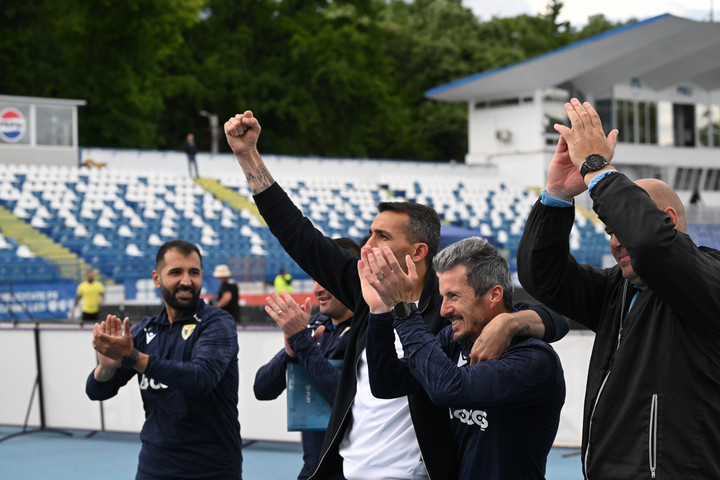 Descriere: Fotbalistii ploiesteni sarbatoresc alaturi de galerie ramanerea in SuperLiga dupa victoria obtinuta in meciul de fotbal dintre Poli Iasi si FC Petrolul Ploiesti, contand pentru SuperLiga Superbet Play-Out, desfasurat pe Stadionul Emil Alexandrescu din Iasi, duminica 18 mai 2025. © FOTO: Tudi/SPORT PICTURES