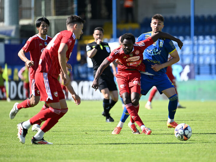 Descriere: Mino Sota, Dimitri Joseph Oberlin si Andrei Cristian Dorobantu in meciul de fotbal dintre Unirea Slobozia si Sepsi OSK Sfantu Gheorghe, din cadrul Play out-ului Superligii Superbet, desfasurat pe Clinceni Arena din Clinceni, duminica 18 mai 2025. © FOTO:Razvan Pasarica/SPORT PICTURES