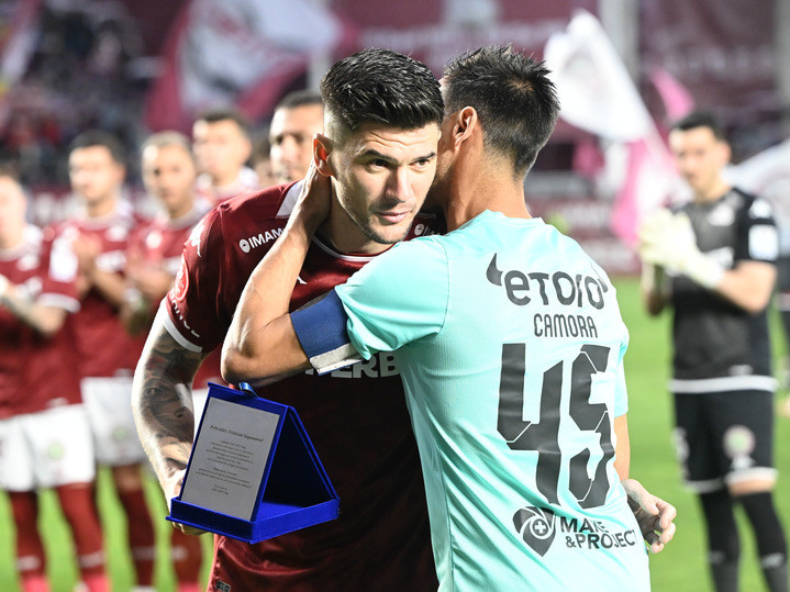 Descriere: Cristian Ionuț Săpunaru primeste o placheta omagiala din partea lui Mario Camora (Malico Paulino Mario Jorge) la startul meciului de fotbal dintre Rapid Bucuresti si CFR Cluj, din cadrul Play off-ului Superligii Superbet, desfasurat pe Superbet Arena Giulesti din Bucuresti, luni 19 mai 2025. © FOTO:Razvan Pasarica/SPORT PICTURES