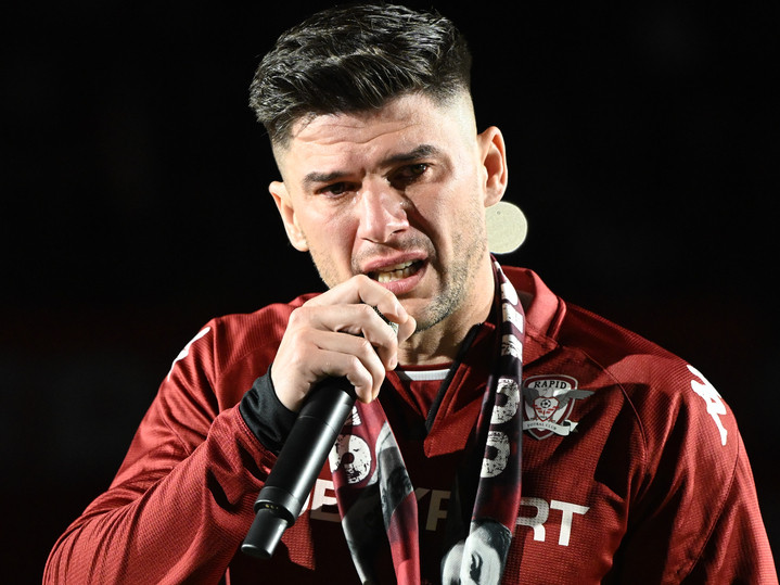Descriere: Cristian Ionuț Săpunaru cu ochii in lacrimi la festivitatea de retragere de dupa meciul de fotbal dintre Rapid Bucuresti si CFR Cluj, din cadrul Play off-ului Superligii Superbet, desfasurat pe Superbet Arena Giulesti din Bucuresti, luni 19 mai 2025. © FOTO:Razvan Pasarica/SPORT PICTURES