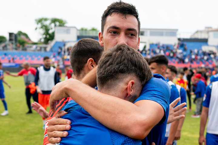 Descriere: Fotbalistii targovisteni bucurosi dupa salvarea de la retrogadare dupa meciul de fotbal dintre AFC Chindia Targoviste si CSC Dumbravita, contand pentru Liga 2 Casa Pariurilor Play-out Baraj evitarea retrogadarii, desfasurat pe Stadionul Eugen Popescu din Targoviste, sambata 24 mai 2025. © FOTO: Marius Tudor/SPORT PICTURES