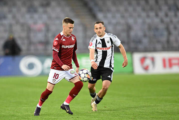 Descriere: Claudiu Adrian Mihai Petrila si Robert Mihai Silaghi in meciul de fotbal dintre FC Universitatea Cluj si FC Rapid 1923 Bucuresti, contand pentru Superliga Superbet Play-Off, desfasurat pe Stadionul Cluj Arena din Cluj-Napoca, sambata 24 mai 2025. © FOTO: Flaviu Buboi/SPORT PICTURES