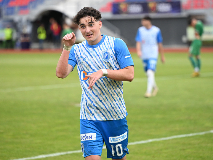 Descriere: Rareș Fabrizzio Tomsa se bucură dupa un gol marcat în meciul de fotbal dintre Universitatea Craiova U18 si Concordia Chiajna U18, finala Cupei de Tineret, desfășurat pe Stadionul Eugen Popescu din Targoviste, duminica 25 mai 2025. © FOTO: Răzvan PĂSĂRICĂ/SPORT PICTURES