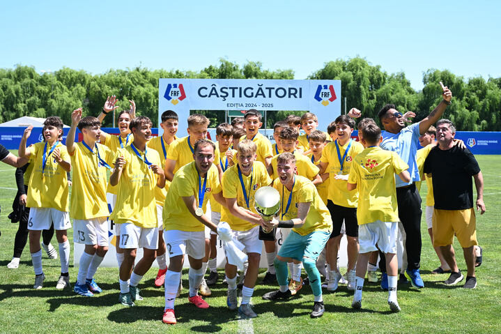 Descriere: Fotbalistii medieseni se bucura dupa castigarea trofeului dupa meciul de fotbal dintre ACS Medias U16 si ACS Centrul German de Fotbal U16, finala Cupei National U16, desfasurat pe Terenul central de iarba din cadrul Centrului National de Fotbal din Buftea, marti 3 iunie 2025. © FOTO:Razvan Pasarica/SPORT PICTURES
