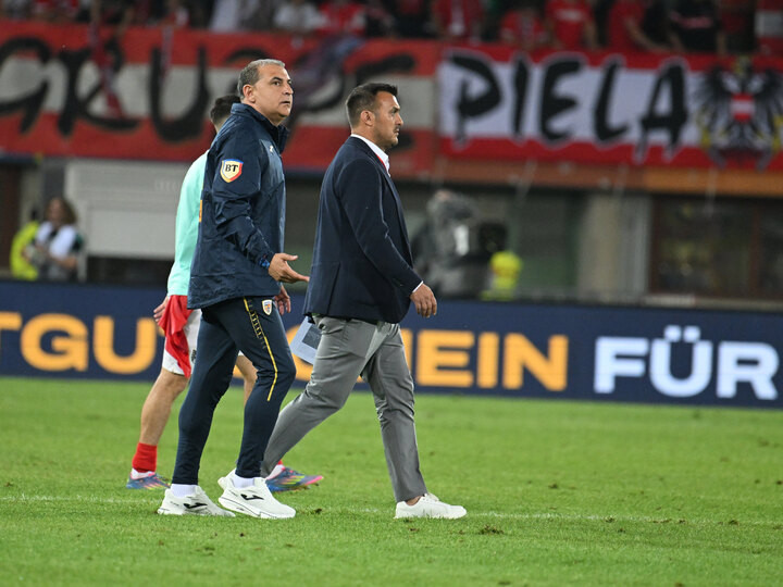 Descriere: Mircea Lucescu reactioneaza alaturi de steagul tricolor in meciul de fotbal dintre Austria si Romania, din cadrul Preliminariilor Campionatului Mondial 2026, desfasurat pe Stadionul Ernst Happel din Viena, sambata 7 iunie 2025. © FOTO:Razvan Pasarica/SPORT PICTURES