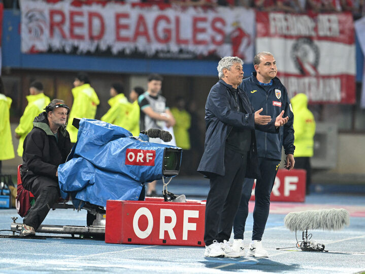 Descriere: Mircea Lucescu reactioneaza alaturi de Ionel Tersinio Gane in meciul de fotbal dintre Austria si Romania, din cadrul Preliminariilor Campionatului Mondial 2026, desfasurat pe Stadionul Ernst Happel din Viena, sambata 7 iunie 2025. © FOTO:Razvan Pasarica/SPORT PICTURES