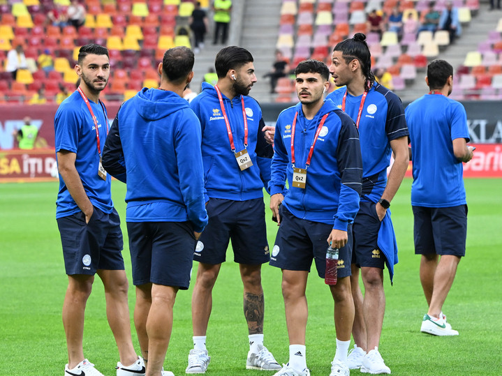 Descriere: Fotbalistii ciprioti la inspectia terenului inaintea meciului de fotbal dintre Romania si Cipru, din cadrul Preliminariilor Campionatului Mondial 2026, desfasurat pe Arena Nationala din Bucuresti, marti 10 iunie 2025. © FOTO:Razvan Pasarica/SPORT PICTURES