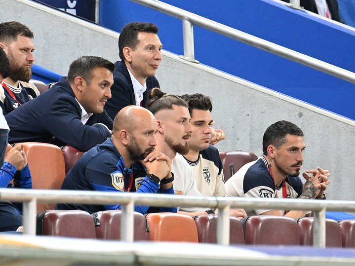 Descriere: Radu Dragusin, Ianis Hagi si Nicolae Stanciu urmaresc din tribuna meciul de fotbal dintre Romania si Cipru, din cadrul Preliminariilor Campionatului Mondial 2026, desfasurat pe Arena Nationala din Bucuresti, marti 10 iunie 2025. © FOTO:Razvan Pasarica/SPORT PICTURES