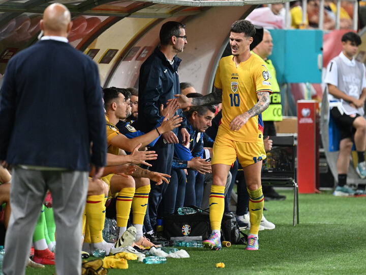 Descriere: Dennis Man este felicitat de banca romaneasca la iesirea de pe teren din meciul de fotbal dintre Romania si Cipru, din cadrul Preliminariilor Campionatului Mondial 2026, desfasurat pe Arena Nationala din Bucuresti, marti 10 iunie 2025. © FOTO:Razvan Pasarica/SPORT PICTURES