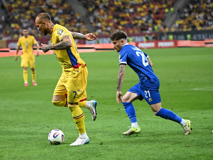 Descriere: Denis Alibec si Konstantinos Laifis in meciul de fotbal dintre Romania si Cipru, din cadrul Preliminariilor Campionatului Mondial 2026, desfasurat pe Arena Nationala din Bucuresti, marti 10 iunie 2025. © FOTO:Razvan Pasarica/SPORT PICTURES