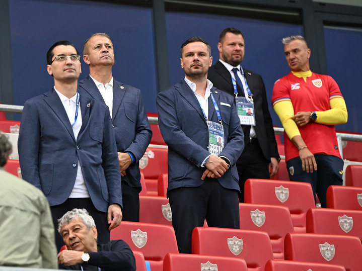 Descriere: Razvan Burleanu, Gabriel Bodescu si Vlad Munteanuin tribuna la meciul de fotbal dintre Italia U21 si Romania U21, din cadrul UEFA EURO U21 2025, desfasurat pe Stadionul Anton Malatinský din Trnava, miercuri 11 iunie 2025. © FOTO:Razvan Pasarica/SPORT PICTURES