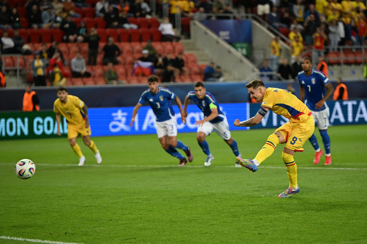Descriere: Louis Munteanu rateaza un penalty in meciul de fotbal dintre Italia U21 si Romania U21, din cadrul UEFA EURO U21 2025, desfasurat pe Stadionul Anton Malatinský din Trnava, miercuri 11 iunie 2025. © FOTO:Razvan Pasarica/SPORT PICTURES