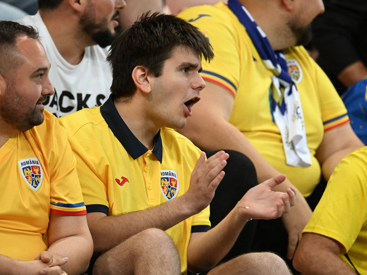 Descriere: Suporterii romani urmaresc meciul de fotbal dintre Italia U21 si Romania U21, din cadrul UEFA EURO U21 2025, desfasurat pe Stadionul Anton Malatinský din Trnava, miercuri 11 iunie 2025. © FOTO:Razvan Pasarica/SPORT PICTURES