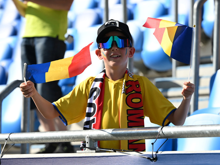Descriere: Suporterii romani isi incurajeaza favoritii la meciul de fotbal dintre Spania U21 si Romania U21, din cadrul UEFA EURO U21 din Slovacia, desfasurat pe Stadionul National de fotbal din Bratislava, sambata 14 iunie 2025. © FOTO:Razvan Pasarica/SPORT PICTURES
