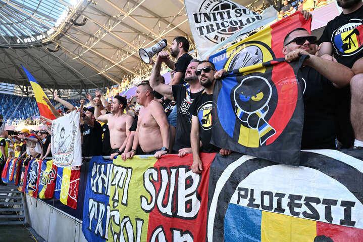 Descriere: Suporterii romani isi incurajeaza favoritii in meciul de fotbal dintre Spania U21 si Romania U21, din cadrul UEFA EURO U21 din Slovacia, desfasurat pe Stadionul National de fotbal din Bratislava, sambata 14 iunie 2025. © FOTO:Razvan Pasarica/SPORT PICTURES