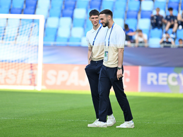 Descriere: Fotbalistii romani Vladislav Blanuta si Razvan Sava la inspectia terenului de dinaintea meciului de fotbal dintre Romania U21 si Slovacia U21, din cadrul UEFA EURO U21 din Slovacia, desfasurat pe Stadionul National de fotbal din Bratislava, marti 17 iunie 2025. © FOTO:Razvan Pasarica/SPORT PICTURES
