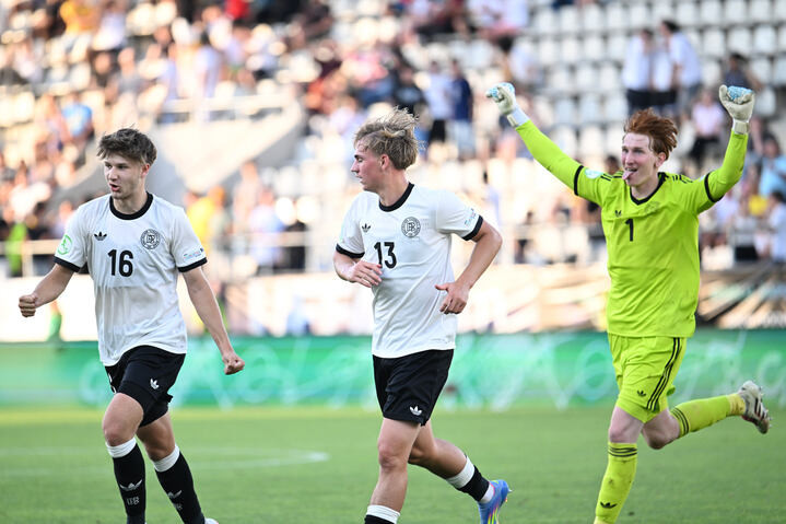 Descriere: Bucurie a fotbalistilor germani Mateo Kritzer, Maximilian Hennig si Konstantin Heide dupa un gol marcat in meciul de fotbal dintre Spania U19 si Germania U19, contand pentru Semifinala Campionatul European U19, desfasurat pe Stadionul Arcul de Triumf din Bucuresti, luni 23 unie 2025. © FOTO: Razvan Pasarica/SPORT PICTURES