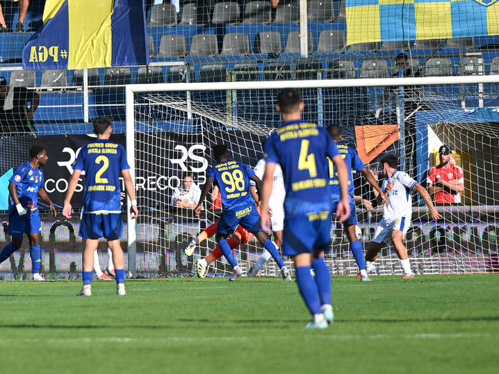 Descriere: Nkama Christ Afalna marcheaza un gol in poarta lui Andrei Raul Balbarau sub privirile lui Ahmed Said Said, Cedric Benjamin Roche Yohan si Robert Ionut Salceanu in meciul dintre Unirea Slobozia si Petrolul Ploiesti, contand pentru Superliga Superbet, desfasurat pe Clinceni Arena din Clinceni, duminica 21 septembrie 2025. © FOTO:Razvan Pasarica/SPORT PICTURES
