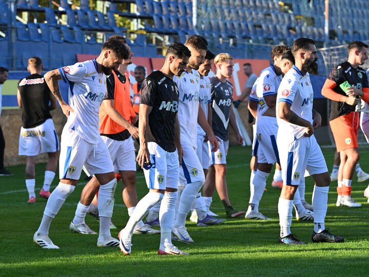 Descriere: Fotbalistii ploiesteni Paul Papp, Valentin Gheorghe, Gheorghe Teodor Grozav si Ferreira Oscar Correira parasesc tristi terenul dupa meciul dintre Unirea Slobozia si Petrolul Ploiesti, contand pentru Superliga Superbet, desfasurat pe Clinceni Arena din Clinceni, duminica 21 septembrie 2025. © FOTO:Razvan Pasarica/SPORT PICTURES