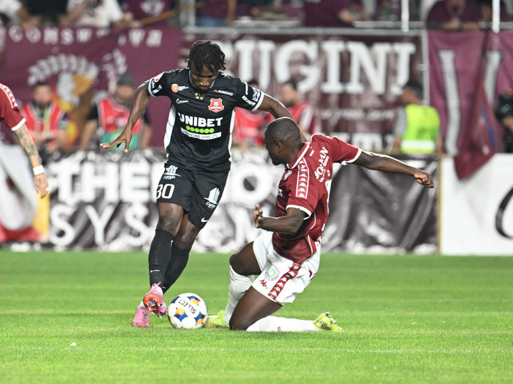 Descriere: Nana Kwame Antwi si Christopher Braun in meciul de fotbal dintre Rapid Bucuresti si FC Hermannstadt, din cadrul Superligii Superbet, desfasurat pe Superbet Arena-Giulesti din Bucuresti, duminica 21 septembrie 2025. © FOTO:Razvan Pasarica/SPORT PICTURES