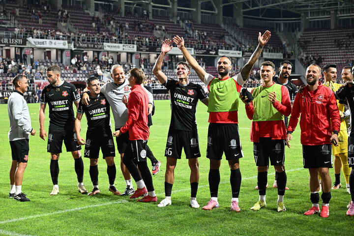 Descriere: Fotbalistii sibieni Sergiu Florin Bus, Antoni Valeri Ivanov, Ciprian Ionut Biceanu, Tiberiu Ionut Capusa, Florin Bejan, Luca Gabriel Stancu si Cristian Daniel Negut saluta galeria dupa meciul de fotbal dintre Rapid Bucuresti si FC Hermannstadt, din cadrul Superligii Superbet, desfasurat pe Superbet Arena-Giulesti din Bucuresti, duminica 21 septembrie 2025. © FOTO:Razvan Pasarica/SPORT PICTURES