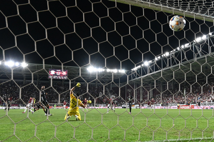 Descriere: Mihai Alexandru Dobre marchează un gol în poarta lui Catalin Vasile Cabuz de langa Vahid Selimovic si Constantin Dragos Albu in meciul de fotbal dintre Rapid Bucuresti si FC Hermannstadt, din cadrul Superligii Superbet, desfasurat pe Superbet Arena-Giulesti din Bucuresti, duminica 21 septembrie 2025. © FOTO:Razvan Pasarica/SPORT PICTURES