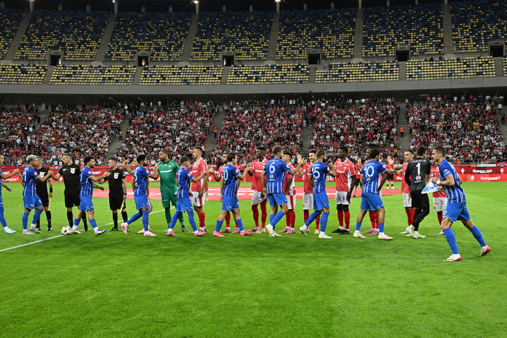 Descriere: Fotbaliștii celor două echipe se salută înaintea meciului de fotbal dintre Dinamo Bucuresti si Farul Constanta, din cadrul Superligii Superbet, desfasurat pe Arena Nationala din Bucuresti, luni 22 septembrie 2025. © FOTO:Razvan Pasarica/SPORT PICTURES