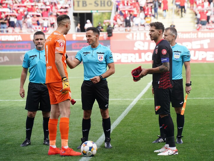 Brigada de arbitri formata din Cristian Moldoveanu, Vasile Marinescu si Adrian Popescu alaturi de capitanii Deyan Iliev si Szilárd Veres la startul meciului de fotbal dintre UTA Arad si FK Csikszereda Miercurea Ciuc, contand pentru Superliga Superbet, desfasurat pe Arena Francisc Neuman din Arad, sambata 27 septembrie 2025. © FOTO:Alexandra Fechete/SPORT PICTURES
