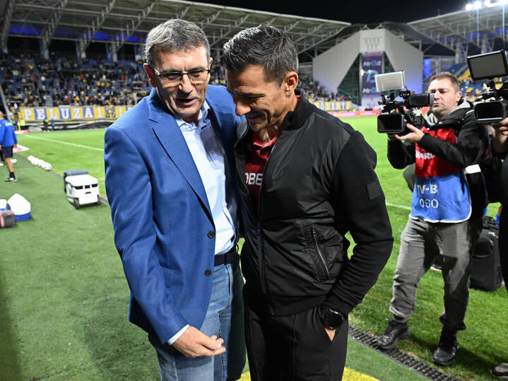 Descriere: Antrenorii celor doua echipe Eugen Neagoe si Constantin Galca se saluta inaintea meciului dintre Petrolul Ploiesti si Rapid Bucuresti, contand pentru Superliga Superbet, desfasurat pe Stadionul Ilie Oana din Ploiesti, sambata 27 septembrie 2025. © FOTO:Razvan Pasarica/SPORT PICTURES