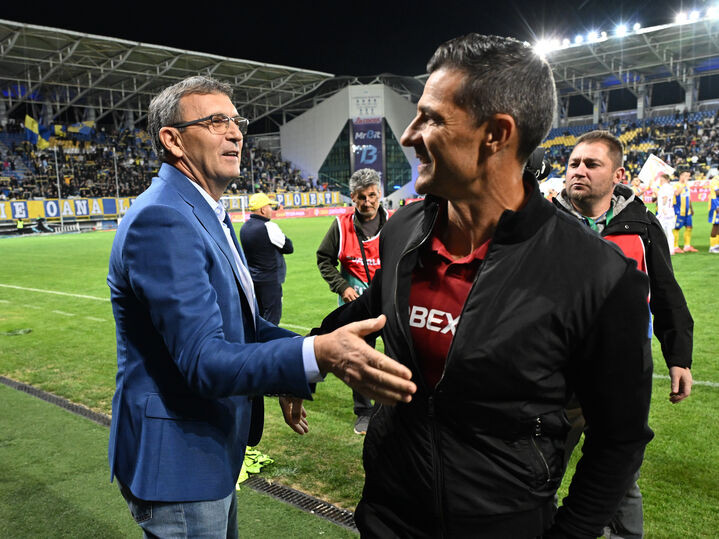 Descriere: Antrenorii celor doua echipe Eugen Neagoe si Constantin Galca se saluta inaintea meciului dintre Petrolul Ploiesti si Rapid Bucuresti, contand pentru Superliga Superbet, desfasurat pe Stadionul Ilie Oana din Ploiesti, sambata 27 septembrie 2025. © FOTO:Razvan Pasarica/SPORT PICTURES