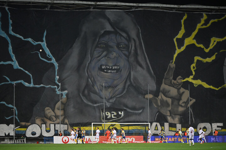 Descriere: Coregrafie petrolista cu trimitere la celebrul film Star Wars prezentata in peluza la meciul dintre Petrolul Ploiesti si Rapid Bucuresti, contand pentru Superliga Superbet, desfasurat pe Stadionul Ilie Oana din Ploiesti, sambata 27 septembrie 2025. © FOTO:Razvan Pasarica/SPORT PICTUR