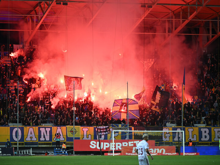 Descriere: Torte, steaguri si fumigene in peluza petrolista la meciul dintre Petrolul Ploiesti si Rapid Bucuresti, contand pentru Superliga Superbet, desfasurat pe Stadionul Ilie Oana din Ploiesti, sambata 27 septembrie 2025. © FOTO:Razvan Pasarica/SPORT PICTURES
