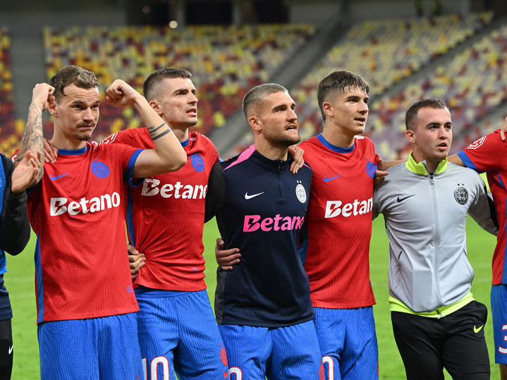 Descriere: Fotbalistii ros-albastrii Grigoraș Alexandru Pantea, Florin Lucian Tănase, George Daniel Bîrligea, Alexandru Constantin Stoian si Mihai Vlăduț Toma saluta galeria dupa meciul dintre FCSB si Otelul Galati, contand pentru Superliga Superbet, desfasurat pe Arena Nationala din Bucuresti, duminica 28 septembrie 2025. © FOTO:Razvan Pasarica/SPORT PICTURES