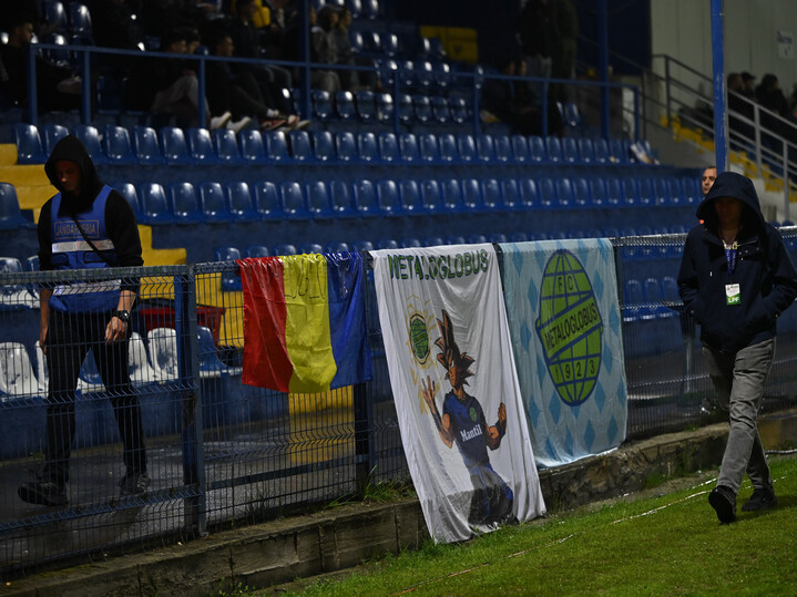 Descriere: Steagul Romaniei si al echipei gazda afisate pe un gard la meciul de fotbal dintre Metaloglobus Bucuresti si FC Botosani, contand pentru Superliga Superbet, desfasurat pe Clinceni Arena din Clinceni, luni 29 septembrie 2025. © FOTO:Razvan Pasarica/SPORT PICTURES